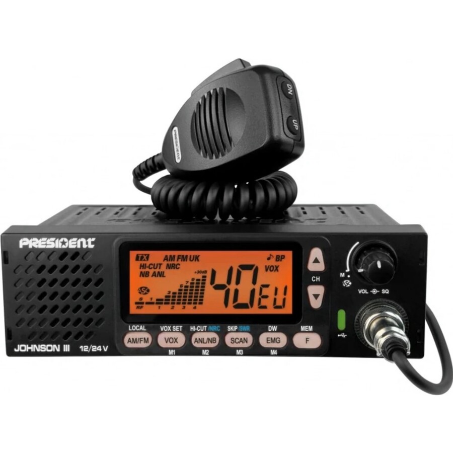 President Johnson II ASC VOX je populární CB radiostanice od značky President s funkcí VOX, která umožňuje bezdotykovou komunikaci mluvením do mikrofonu, a navíc má zabudovaný reproduktor na předním panelu pro snadnou montáž do vozidla. Radiostanice je vybavena pokročilými funkcemi jako automatická squelch (ASC), paměti, skenování kanálů a multinormní režim. Napájení funguje na 12 V i 24 V, což je ideální pro kamiony a další vozidla.
