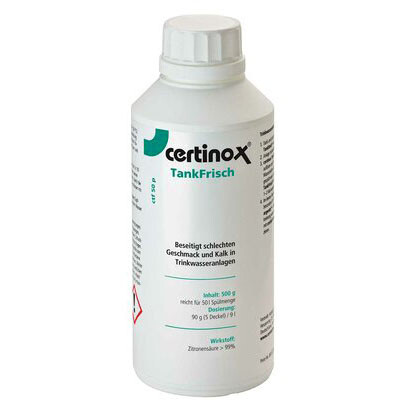 Čistič vodovodního systému Certinox Tankfrisch CTF 50 P odstraňuje z nádrží, trubek a čerpadel usazeniny vápníku. Obsaženou kyselinou citronovou eliminuje nepříjemný zápach a pachuť ve vodovodním systému. Kromě toho chrání čerpadlo před opotřebením. Obsahuje ionty stříbra, které chrání před opětovným znečištěním.