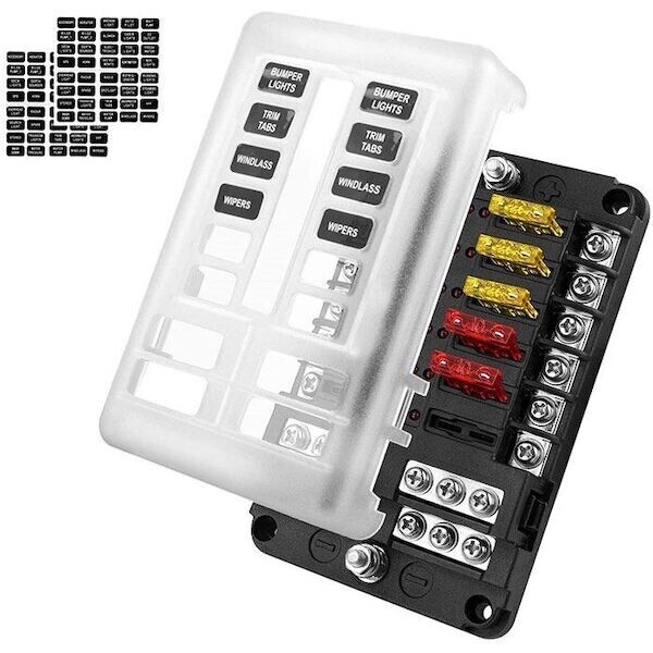 Distribuční blok pojistek s centrálním přívodem kladného i záporného pólu a 12 pojistkami s optickou kontrolou stavu přerušení (12× LED).