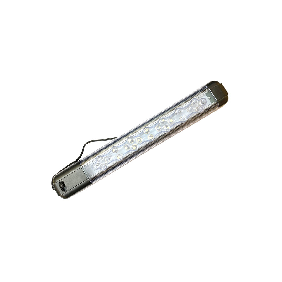 Vnitřní interiérové LED světlo, vhodné do osobních, nákladních vozidel, obytných automobilů, nebo i pro jiné využití. Světlo je vybaveno dotykovým vypínačem. Technické parametry • napájecí napětí 12-24 V; 12 V @ 0,78 A, 24 V @ 0,38 A • homologace R10 • svítivost 600 +/- 60 lm; 9,5 W • barva světla 6000 +/- 500 K • dotykový vypínač na světle • kvalitní provedení, tělo světla z hliníku • bílá barva • rozměry: délka 313,9 x 50 mm, výška 18,5 mm • uchycení na šrouby, rozteč 292 mm